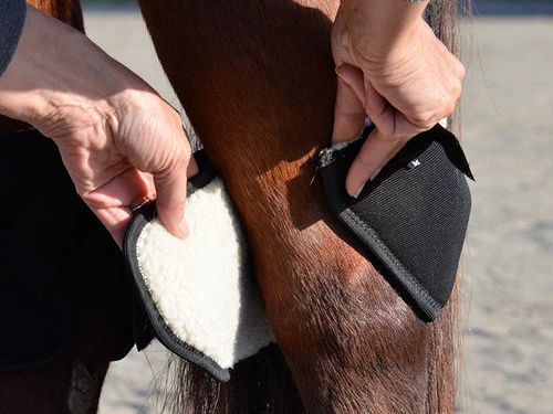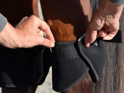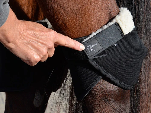 To find your horse’s correct size, have the horse stand with its leg straight and hoof flat on the ground. Measure the smallest area just above the hock joint and compare to the size guide. Do not size up! The elastic straps will stretch so it’s better to have a slightly too small fit at first.Β