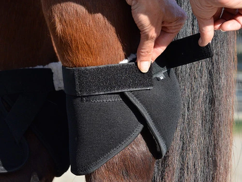 Some horses twist hard when they get up off the ground, which can cause a hock sore or aggravate a healing one. The Hock Shield Ultra is designed for these horses and their owners! It can also be useful for extra warmth for a horse with arthritis. The Hock Shield Ultra consists of a tough outer covering with a double layer of fleece inside. Elastic straps provide flexibility. The hock wrap attaches with hook and loop tape so you can adjust the fit. Hock Shield Ultra hock wraps can be worn full time if needed for the horse with chronic hock sores.