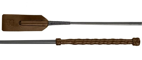 DΓΆbert Big Flap Leather Crop has a flexible nylon core and a long, wide keeper end. The Big Flap Leather Crop has a smooth nylon shaft (not covered in fabric) in black while the tip and wavy grip are chocolate brown leather. The shaft has a brand sticker in silver lettering.