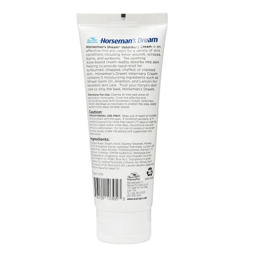 Horseman’s Dream Veterinary Cream from Manna Pro offers rapid relief for minor burns, cuts, abrasions, and other skin injuries on horses. The soothing aloe vera and wheat germ oil help skin heal quickly and relieve painful or itchy crusting. Horseman’s Dream contains vitamins A, C, and E for extra healing power.