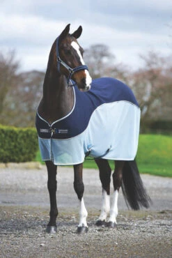 Rambo Sport Cooler is the ultimate warm weather horse cooler that is handsome & functional. The Rambo Sport Cooler combines a luxurious brushed cotton fabric on top and air textured polyester net sides. This dual effective cooler is outstanding, preventing your horse from overheating on hot days. Horseware Ireland Rambo cooler is super-wicking on top with cotton-rich fabric that will pull moisture away from the horse. Side netting is contoured and allows free air flow for very fast drying. Team with Rambo Grand Prix accessories for a stunning look at shows! In Navy/Light Blue and Navy/Red.