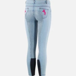 Horze Jessie Denim Full Grip Breeches with silicone print seat are denim-styled riding breeches with soft stretch fabric. Women’s high waist full seat horseback riding breeches offer a lightweight, comfortable fit and elegant details. The Jessie full grip seat is printed in a fancy Horze emblem that matches the gold embroidery on the back pocket.
