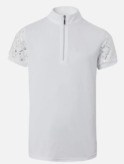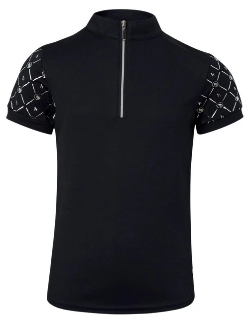 Horze Kids Fia Short Sleeve Shirt is absolutely perfect for summer riding with its lightweight micropolyester fabric and metallic accents that shine in the sun. Girls short sleeve polo style shirt has a mock collar and quarter length zipper. The fabric is a pique knit while the sleeves are smooth with pique cuff bands. The sleeves have a silver checked pattern on with little Horze logos.