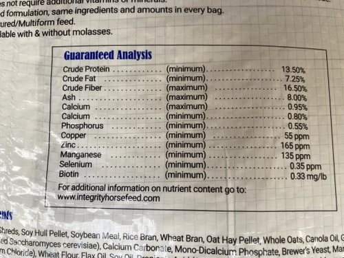 A balanced low starch/low sugar feed for adult and senior horses that are active or with light to moderate work. Integrity Adult/Senior is ideal for endurance and horses that work in high temperature and humidity. Beet pulp & soy hulls encourage gut health and also gut reservoir for water and electrolytes. Contains added prebiotics, probiotics & yeast cultures.