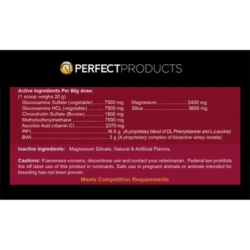 Joint Impact from Perfect Products supports joint health and horse comfort with a combination of proven ingredients. With the comfort enhancing, tissue-soothing, and joint supporting ingredients in Joint Impact, your horse can move better and feel better without prohibited substances. The comfort enhancing proprietary complex does not have harmful side effects sometimes found in pain blockers.