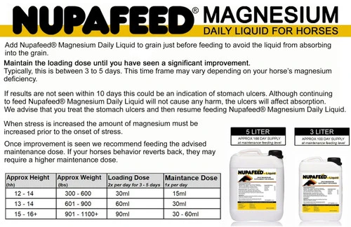 Nupafeed Magnesium Daily Liquid is a magnesium supplement to help your horse manage stress and anxiety on a daily basis. NupafeedΒ contains a unique form of magnesium, MAH (magnesium aspartate hydrochloride). MAH is a refined source of magnesium offering exceptionally high absorption rates and increased bio-availability.