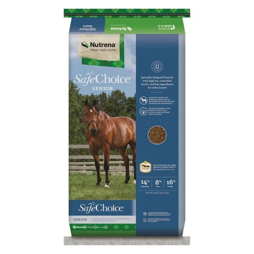 SafeChoice Senior gives your old friend what she needs to make every year golden. Itβs specifically designed for older horses over the age of fifteen, especially those suffering from unexpected age-related weight loss, exhibiting sluggishness, experiencing issues with muscle or coat quality, or having difficulty chewing their hay.