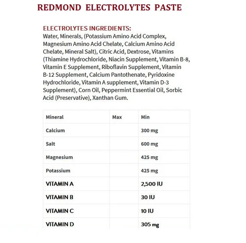 Redmond Electrolyte Paste helps keep your horse hydrated with a fast-acting targeted dose of critical electrolytes and vitamins. Horses love the Peppermint flavor so it’s easier to administer. Redmond Electrolyte Paste triggers your horse to drink more as it replenishes electrolytes lost due to heat, exercise, or nervousness.