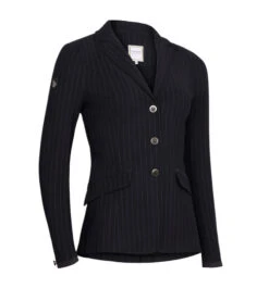 The Samshield Alix Jacket is manufactured in an environmentally conscious way to minimize its ecological impact. The fabric is also wrinkle free and machine washable for easy care. The Alix has a feminine profile with double vent in back and functional front flap pockets that secure with a hidden zipper. The Alix Jacket is part of Samshield’s Premium Line of equestrian apparel and has stylish touches throughout. The top of the pockets and the edge of the cuffs are trimmed in microsuede to match the fabric. The buttons are custom Samshield signature buttons in a subtle flat metal finish. The cuffs have matching smaller buttons as an accent. Riders will appreciate the lovely drape, the figure flattery, and all the practical elements of the Alix Jacket while they are under the judge’s watchful eye. Samshield Alix Jacket is available in Black Tennis Stripe, Black, and Navy.