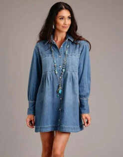 The Stetson Denim Shirt Style Dress is a beautiful Western style dress with rugged good looks and pleat accents. Women’s Denim Shirt Style Dress from Stetson has that classic look that never goes out of style and is versatile for wearing alone or layering. the full cut is roomy, comfortable, and is a great silhouette for dressing up or down.